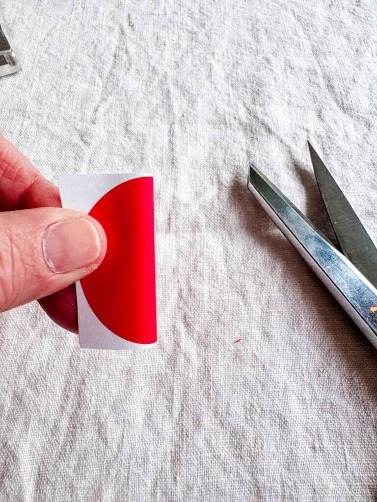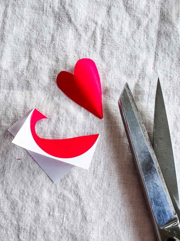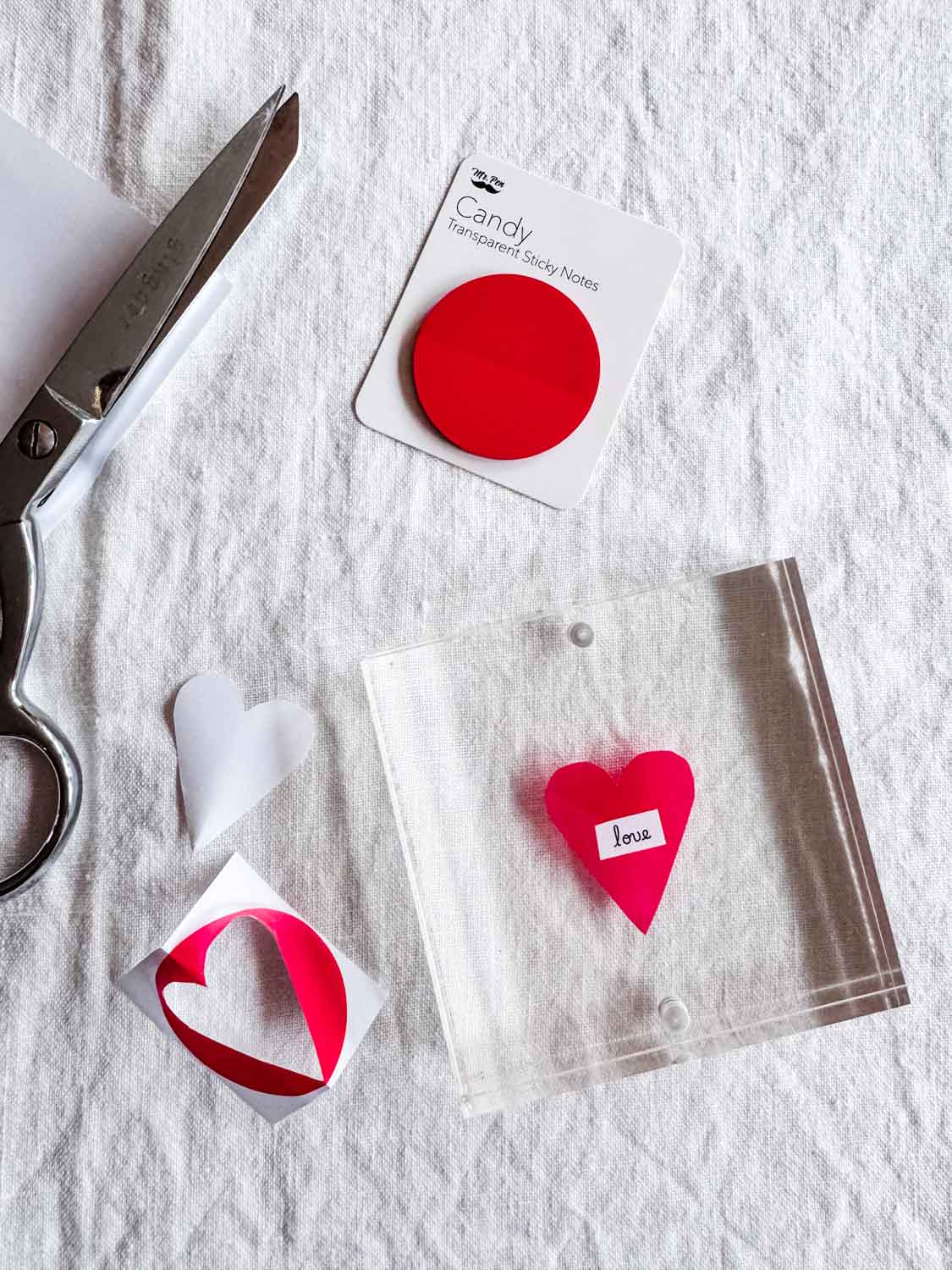 I used small, transparent sticky notes and placed one onto a piece of paper. I carefully folded it in half—without creasing—and cut out half of a heart. After removing the paper, I stuck the heart to the inside of the 4″ x 4″ acrylic frame.