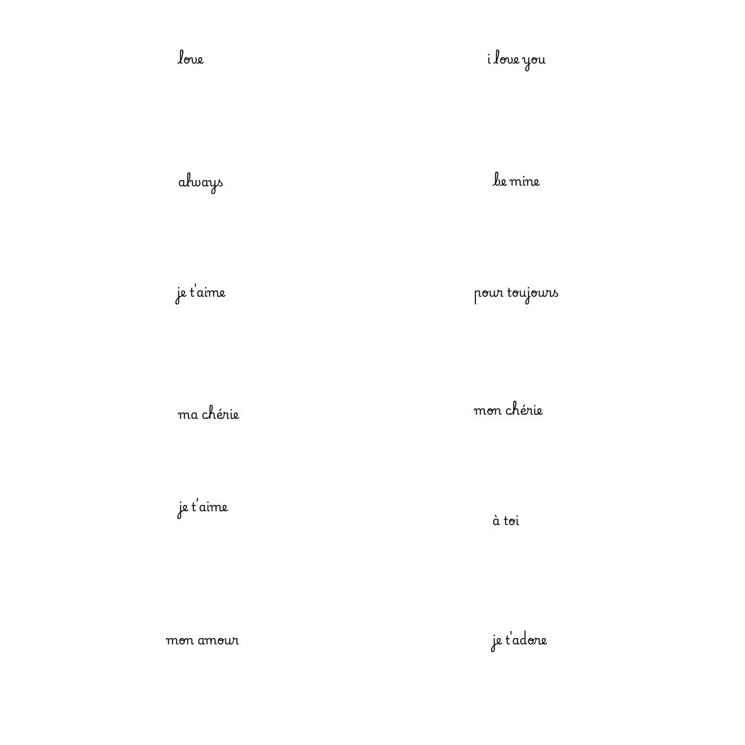 For each frame, I cut a small heart from transparent sticky note paper and paired it with a short saying. Some are in English, some in French—because a little French always feels romantic, doesn’t it?.