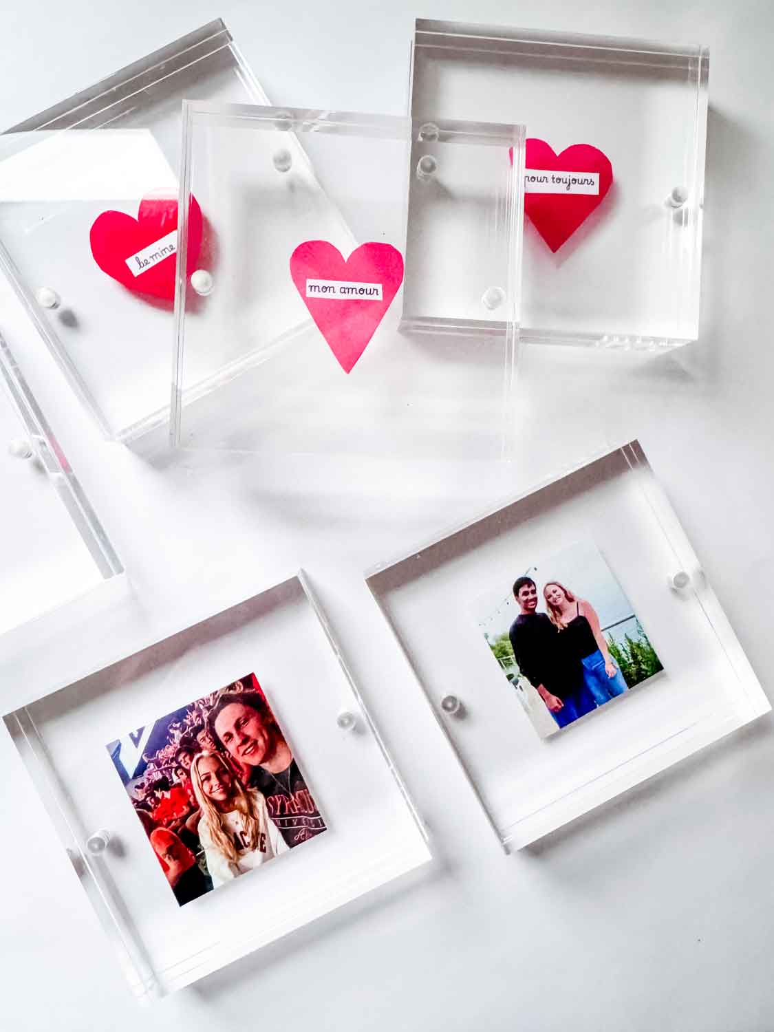 There’s something about Valentine’s Day that makes me want to make something homemade, but also a little useful. Nothing over the top, just a little something thoughtful. This year, I’ve been playing around with small square acrylic frames, and they turned into the sweetest little Valentine craft. Once Valentine’s Day is over, the magnetic acrylic frame can hold a special photograph or other small memento.