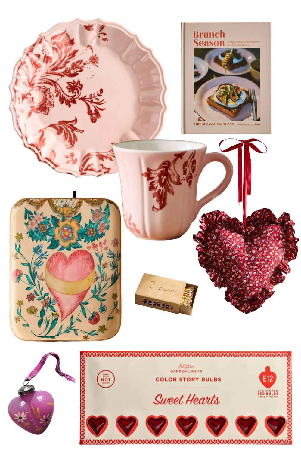 The Botanical Silhouette Side Plate and Mug are so pretty in a soft pink. I have them in green and use them often. You can see them in this post. // Newly released Brunch Season Cookbook // Tray // Painted Enamel Matchbox // Illuminated Frabric Heart would be so charming in a little girl’s bedroom // I have this Painted Glass Heart hanging in my kitchen on a vintage peg rack like this one from our shop.// Color Story Heart Bulbs // Floral Heart Medallion on a Stand