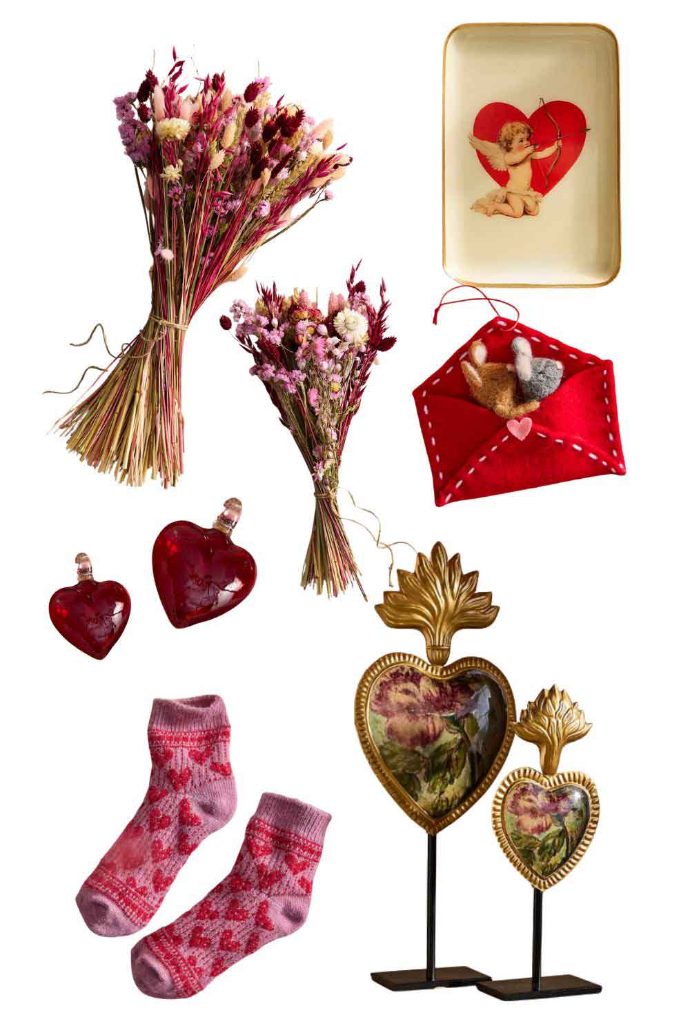 Glass Heart Taper Holders // Mauve Fluted Glass + Iron Vase // Dotted Rim Pink Glass Vase // Colorful Footed Glass Vase // Bouquet of Dried Flowers // Valentine Mice Felt Critters // Small Archival Tray (set of 2) // Glass Heart Ornaments // Cozy Socks with Hearts // Enameled Floral Heart Medallion + Stand