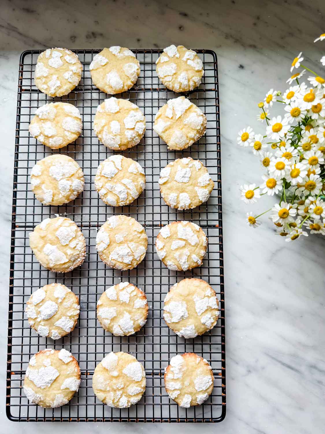 Since the cookie dough is moist, sometimes the powdered sugar seeps in, melts, and then disappears into the dough during the baking process. So if you like more of the pronounced crackle in the cookies, roll them first in granulated sugar and then in powdered sugar.