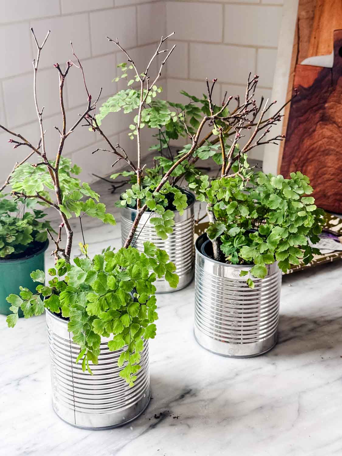 One of my favorite things to use are simple tin cans repurposed as planters. There’s something I love about the contrast between a humble container and a delicate maidenhair fern. The cans don’t need to be hidden or dressed up — they’re part of the charm.
